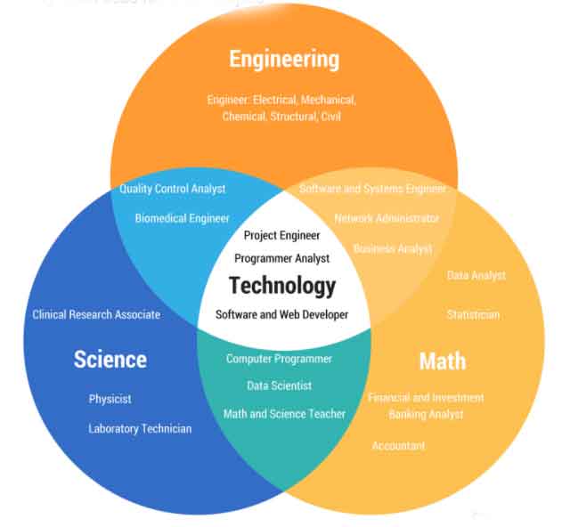 Back to BlogsAs our world continues to advance significantly, science, technology, engineering, and mathematics are becoming attractive skillsets for innovative workers. Seeking creativity, problem-solving, and comprehension, the prospect of having experience in STEM is encouraging and promising. Together, they make an appealing array of opportunities, as one can see in this Venn diagram: